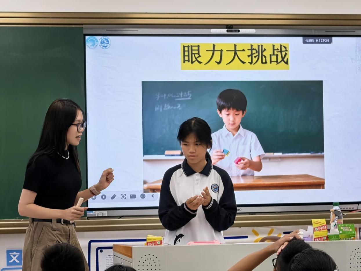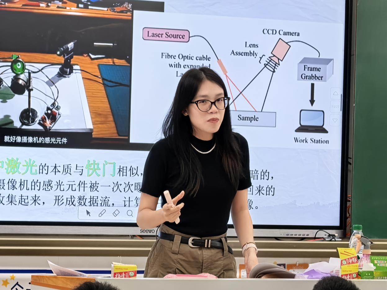 课程以“眼力大挑战”小游戏拉开序幕,引导同学们捕捉台上同学左右手飞速传递橡皮擦的瞬间。随后,张欣雅巧妙地将话题转向人类视觉的极限,将阿秒激光比作超级快门,能够“冻结”电子运动的精彩时刻。她通过生动动画演示,展现阿秒脉冲如何捕捉原子内部电子的超快行为,使原本不可见的微观过程跃然眼前。接着,她引用最近网上流行的激光梗——“在上海东方明珠吃冰激凌被激光攻击”,以幽默方式吸引大家注意力,引出激光在现实中的应用边界与科学幻想的区别,并通过视频让同学们直观感受其极短的时间尺度。她解释道,阿秒激光并非武器,而是探索微观世界的关键工具,能帮助科学家研究化学反应的本质、揭示材料性能的根源,并推动新一代电子器件的发展。在知识问答环节,同学们踊跃举手,争相回答关于阿秒激光时间尺度与应用的问题,现场气氛热烈。作为奖励,张欣雅向答对问题的同学赠送了科普实验套装,鼓励同学们在动手实践中进一步激发科学兴趣。课程尾声,她还鼓励同学们保持好奇心,未来或许能亲手操控这束光,揭开更多自然奥秘。